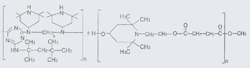 化学名:聚{[6-[(1,1,3,3-四甲基丁基)氨基]]-1,3,5-三嗪-2,4-双[(2,2,6,6,-四甲基-哌啶基)亚氨基]-1,6-己二撑[(2,2,6,6-四甲基-4-哌啶基)亚氨基]}与聚丁二酸(4-羟基-2,2,6,6-四甲基-1-哌啶乙醇)酯的复合物。